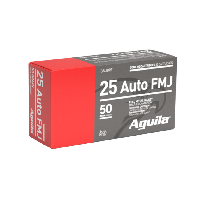 This Aguila 25 ACP Auto ammunition is loaded with a 50 grain Full Metal Jacket bullet. Aguila offers high-quality rounds that cycle flawlessly with remarkable consistency in both velocity and accuracy. All Aguila meets SAAMI and CIP standards guaranteeing the reliability and performance that customers demand.