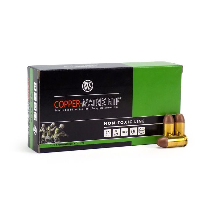 Copper Matrix NTF Bullets contain no toxic heavy metals such as lead. Frangible bullet construction immediately disintegrates into small fragments upon striking a hard steel surface. Back splatter is eliminated. Ricochet potential is significantly reduced. Copper Matrix NTF ammunition functions reliably with duty weapons without modification.
