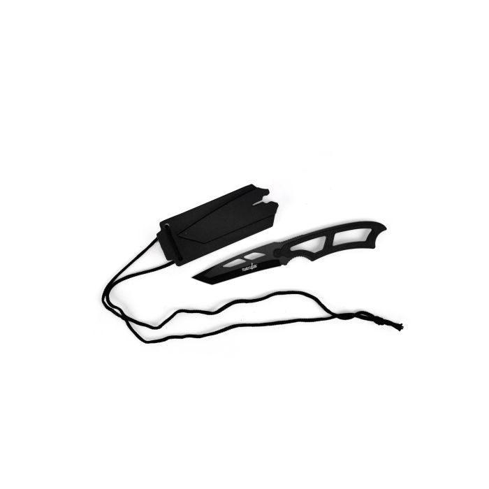 This neck knife from Survivor is a great for keeping a blade within reach. The tanto blade measures 3" and is constructed from stainless steel with a black finish. Handle measures 3.75" and is made of stainless steel with a nub that clicks into the sheath. Includes nylon sheath with whistle blower.