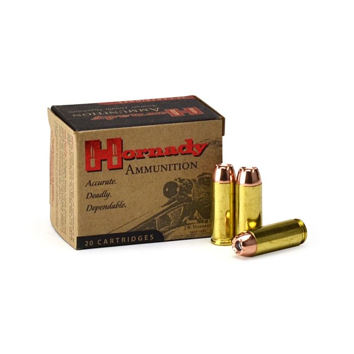 This Hornady Custom pistol ammo is loaded with the famous Hornady XTP (Extreme Terminal Performance Hollow Point bullet. All are supremely accurate, and deliver maximum knockdown power. Hornady produces most of the brass for Hornady Custom pistol ammo. All other brass is chosen to ensure it meets our unusually high standards for reliable feeding, corrosion resistance, proper hardness and the ability to withstand maximum chamber pressures. Each cartridge is loaded to ensure optimal pressure, velocity and consistency from lot to lot. Like the powder, each primer is carefully matched to individual loads, and specifically selected for their ability to quickly, completely, and reliably ignite the powder charge.