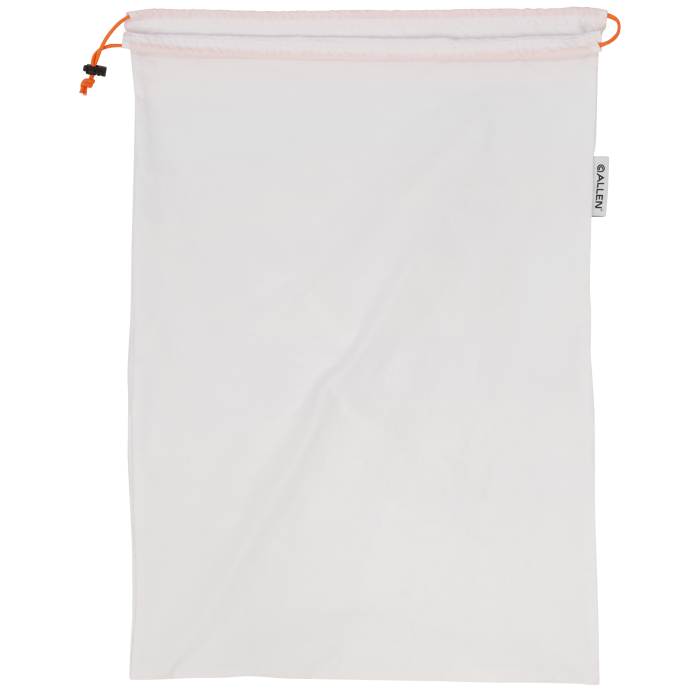 The Allen BackCountry Game Bag is expertly designed for hunters seeking a reliable solution for transporting game meat. Crafted from durable white polyester, this bag measures 30 inches in length and 20 inches in width, making it perfect for holding deer or antelope quarters as well as boned-out meat. Its ultralight, washable, and reusable material ensures longevity, while the robust construction guarantees secure storage. The reflective draw cord with a cinch toggle enhances visibility and keeps the bag tightly closed even in low light conditions. Additionally, the breathable wicking material aids in moisture management, and the blaze orange storage pouch keeps the bag organized and easily accessible. Clearly labeled with size and washing instructions, this game bag offers convenience and efficiency for every hunting expedition.