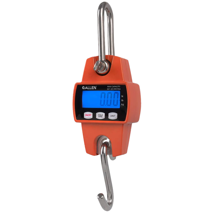 The Allen Company Digital Game Scale offers a blend of durability and practicality, perfect for outdoor enthusiasts. Its vibrant orange hue ensures easy visibility, while the stainless steel construction promises long-lasting performance. This handheld scale features a sleek dismounted hook and shackle that assemble quickly, allowing you to efficiently weigh game or other items with ease. Powered by AAA batteries, it provides reliable measurements, making it an essential tool for any hunting or fishing adventure.
