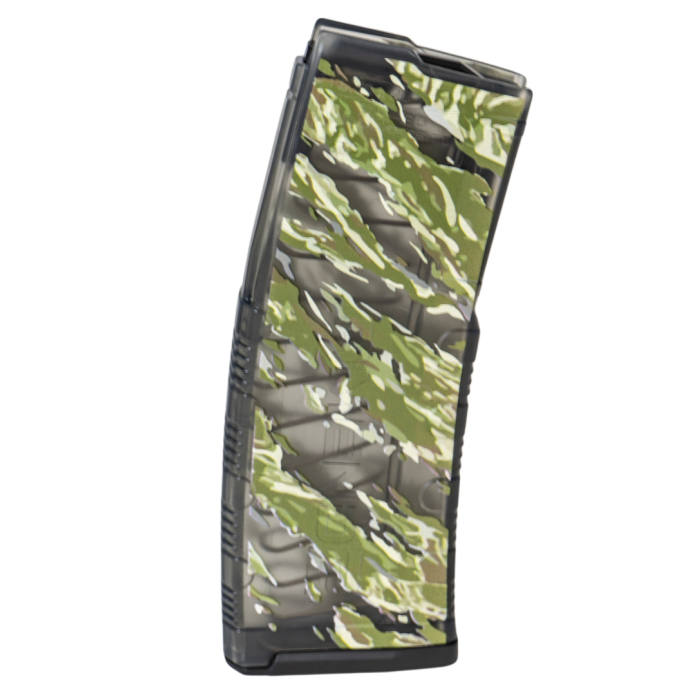 The Amend2 MOD-C Tiger Stripe Magazine combines distinctive aesthetics with proven reliability in a 30-round capacity design. Built from translucent smoke polycarbonate with a custom printed tiger stripe pattern, this AR-15 magazine delivers visual round count verification while maintaining the durability and performance Amend2 is known for.