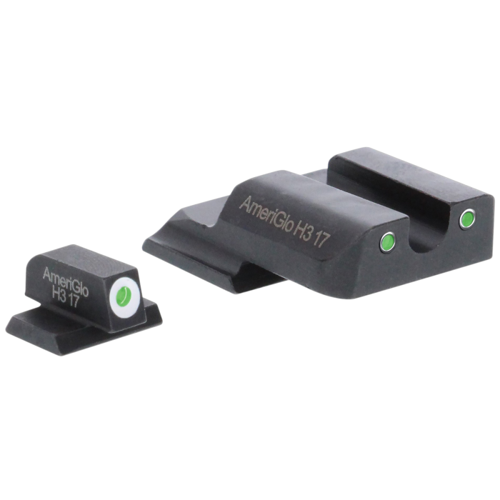 The AmeriGlo Classic Tritium Night Sights are designed specifically for the Smith & Wesson M&P Shield, offering exceptional visibility in any lighting condition. Constructed from durable steel with a sleek black finish, these sights feature a green tritium lamp with a white outline on the front and two matching green tritium lamps with white outlines on the rear. This 3-dot night sight set ensures you can quickly and accurately acquire your target, enhancing your shooting experience with precision and confidence.