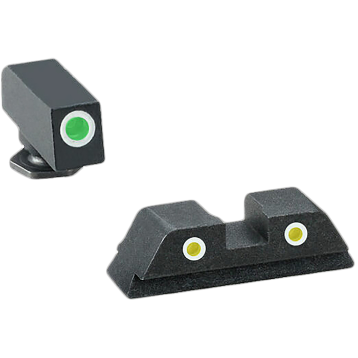 The AmeriGlo Classic Tritium Sight Set is expertly crafted for Glock pistols, offering enhanced accuracy and visibility in any lighting condition. This set features a durable black steel frame, ensuring longevity and resilience. The front sight is equipped with a vibrant green tritium lamp, complemented by a white outline for quick target acquisition. The rear sight includes two yellow tritium lamps, also outlined in white, providing a clear sight picture. Designed to fit Glock generations 1 through 5, this sight set is compatible with a range of calibers including 9mm, .40, .380, 10mm, and .45, making it a versatile choice for Glock enthusiasts seeking reliable performance.