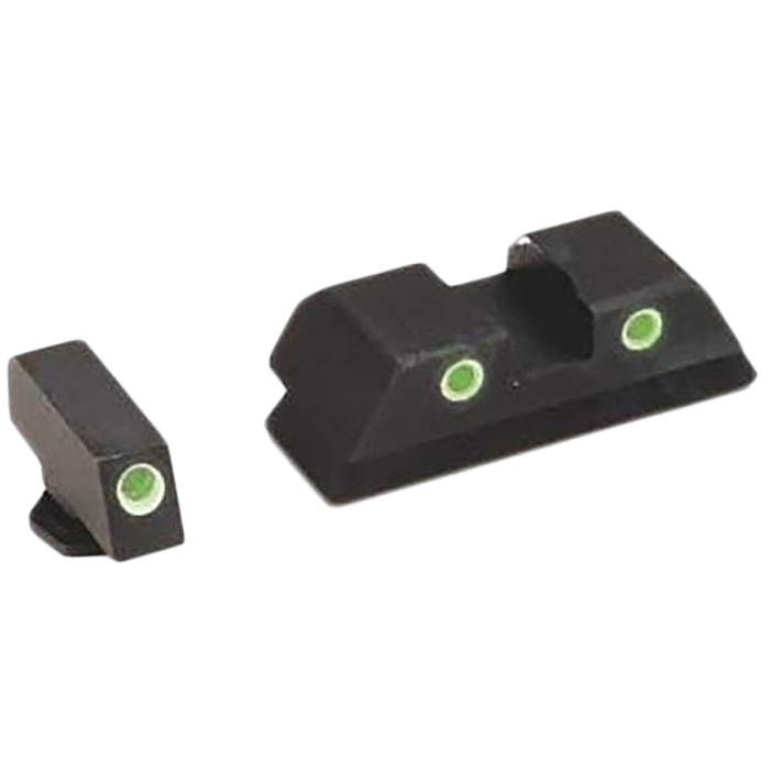 The AmeriGlo Classic Tritium Sight Set is designed for Glock Gen 1-4 pistols, offering exceptional visibility in all lighting conditions. This set features a green tritium lamp with a white outline for the front sight and two green tritium lamps with white outlines for the rear sight. Constructed from durable black steel, these sights are tailored for precise targeting with 10mm, .45, and .357 calibers. The 3-dot night sight configuration ensures quick target acquisition, making it an ideal choice for both day and night use.