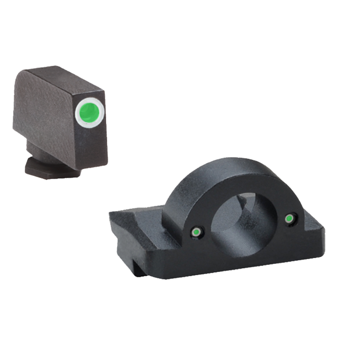 Enhance your shooting precision with the AmeriGlo Ghost Ring Tritium Sight Set for Glock pistols. Engineered for a seamless fit on Glock Gen 1-4 9mm, .40, .380, and Gen 5 10mm, .45 models, this sight set offers a distinct upgrade to your firearm. The ghost ring design employs an aperture-style rear sight paired with two tritium mini-dots, perfectly complementing the bright tritium front sight. This combination naturally guides your eye to center in the rear ring while maintaining focus on the front sight, ensuring swift and accurate target acquisition. Constructed with a robust steel frame in a sleek black finish, the sight set promises durability and reliability. Both the front and rear sights feature green tritium elements, with the front sight further enhanced by a white outline for optimal visibility in low-light conditions. Whether for personal defense or competitive shooting, this sight set offers a significant advantage for any Glock owner.