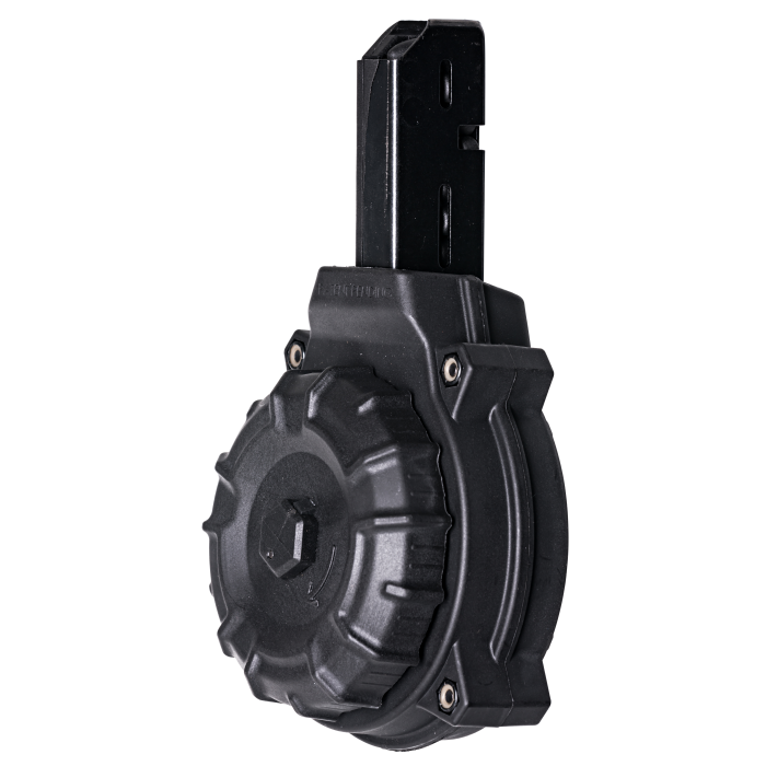 The AR-15 Colt/SMG Type 50rd Drum Magazine in Polymer Black offers high-capacity performance with a lightweight and durable design. Engineered for reliability, this drum magazine holds up to 50 rounds, ensuring extended shooting sessions without frequent reloading. The robust polymer construction provides excellent resistance to impact and wear, making it ideal for both tactical and recreational use. Its sleek black finish adds a tactical edge, while the easy-to-load design ensures seamless operation. Perfect for enthusiasts looking for efficiency and endurance in their shooting experience.