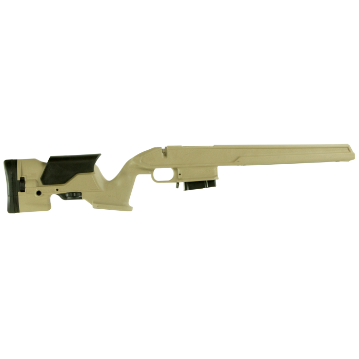 The Archangel Precision Series AA1500 Adjustable Rifle Stock is a high-performance upgrade designed for the Howa 1500, Smith & Wesson 1500, and Weatherby Vanguard short action rifles chambered in .308-based cartridges. Made in the USA, this stock features an aluminum pillar bedding system for enhanced precision and stability. Its ergonomic gooseneck grip with palm swells and a flared base offers superior control, while the locking storage compartment adds convenience. The adjustable cheek riser provides 1.5 inches of travel in 0.05-inch increments, and the length of pull is customizable between 13.5 and 14.625 inches for a perfect fit. The varmint-barrel sized channel ensures compatibility with most barrel contours, allowing for free-floating barrels. An internally integrated, steel and aluminum reinforced bi-pod deploys with a single hand and features textured feet for added stability. This stock also converts ADL, BDL, and DM models to a double-column detachable magazine system with a rear paddle release. Finished in desert tan and crafted from durable carbon fiber and polymer, the Archangel AA1500 combines precision, functionality, and style. Includes one 10-round Archangel .308 magazine.