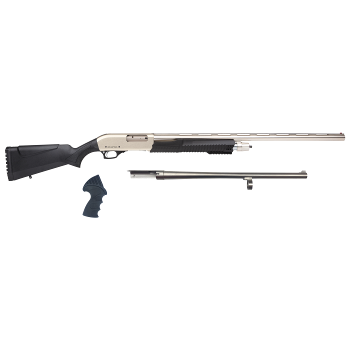 This three-in-one shotgun comes ready to tackle any self defense, tactical or sport shooting need.Built with 18.5 cylinder bore smooth barrel and 28 vent rib barrel with a 5+1 capacity.Add a synthetic rear removable stock and optional pistol grip to form a shotgun package that can provide in the field or defend in the perimeter.