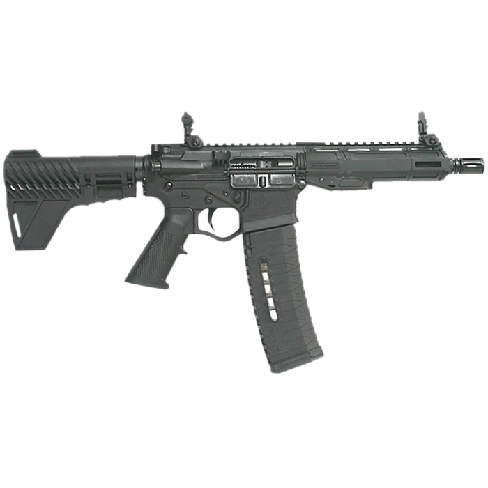 This AR-pistol combines practical features with substantial capacity in a manageable package. The 7.50" steel barrel provides adequate velocity while maintaining a compact profile for close-quarters use. The polymer construction reduces overall weight without sacrificing durability, while the M-LOK handguard offers versatility for mounting accessories. The included flip-up sights provide immediate target acquisition capability straight out of the box, making this pistol ready for range time or defensive applications.