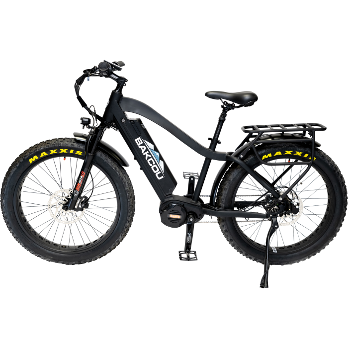 The Bakcou Mule Jager Matte Black 18" E-Bike is a robust and versatile ride tailored for adventurers who demand performance and reliability. At its core is the Bafang Ultra mid-drive motor, renowned for its intelligence and power. With sensors monitoring speed, cadence, and torque, this motor responds precisely to the rider's needs, delivering a seamless riding experience. The Rohloff 14-speed internal gear hub allows effortless shifting through its extensive range, even while stationary, eliminating the need for a derailleur and enhancing durability in challenging terrains. Equipped with a sturdy powder-coated aluminum skid plate, the Mule Jager is well-protected against the elements. The bike boasts exceptional torque output and peak wattage, paired with Tektro hydraulic brakes for superior stopping power. The RST Renegade air fork suspension and wide Maxxis Minion tires ensure a smooth and stable ride, while ergonomic handlebar grips and a shock-absorbing seat post enhance comfort. Designed for those who venture off the beaten path, the Mule Jager is the ultimate companion for exploring rugged landscapes.