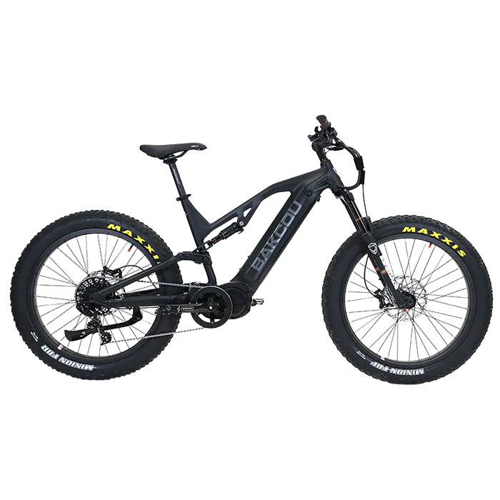 The Bakcou Scout E-Bike in Matte Black is designed for those who seek adventure on rugged trails. Its 19-inch frame makes it suitable for riders 5'10" or taller, ensuring a comfortable and efficient ride. Equipped with a powerful Bafang Ultra Mid-Drive Motor, the bike delivers an impressive 160Nm of torque and a peak wattage output of 1500, making steep climbs and challenging terrains a breeze. The 11-speed Sram NX cassette provides smooth gear transitions, while the robust fat tires ensure maximum traction on various surfaces. With its RST Renegade Air Fork offering 120mm of travel and the Rockshox Monarch Air Rear Suspension, the Scout absorbs shocks effortlessly for a smoother ride. The Tektro HD E750 Quad Piston Hydraulic brakes ensure reliable stopping power, with 203mm front and 180mm rear rotors. Additional features like the DP C18.UART full-color LCD, left thumb throttle, and SR Nebula Sport Saddle enhance your riding experience. The Scout's aggressive skid-proof wide stance pedals and derailleur guards are designed for durability and control, making this e-bike a true crossover sport trail companion.