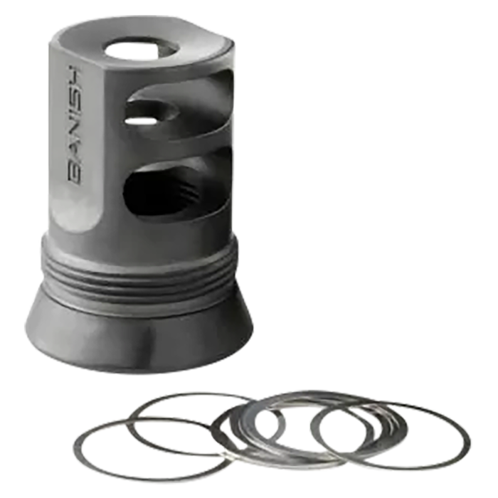 The Banish 30 Gold Muzzle Brake offers versatility and ease of use for firearm enthusiasts. Designed to fit various host firearms, it allows for quick adaptation with its interchangeable muzzle brake feature. This product ensures a seamless fit with different barrel threads and includes a shim kit for precise alignment and installation. Perfect for those looking to enhance their shooting experience with minimal hassle.
