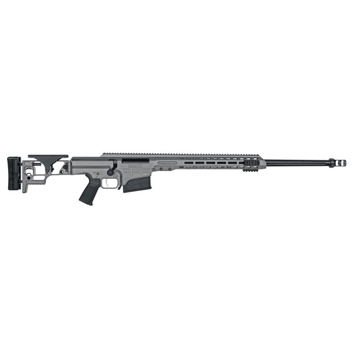 The Barrett MRAD .308 Win is a bolt-action rifle designed for precision and adaptability, making it suitable for both range shooting and professional use. Its 22-inch fluted barrel, with a 1:10" twist rate, ensures accuracy and consistency. The rifle features a robust monolithic upper receiver crafted from 7000 series aluminum, integrating a full-length M1913 Picatinny rail with a built-in taper for enhanced long-range precision. The handguard is equipped with mounting slots at 3, 6, and 9 o'clock positions, offering a versatile platform for attaching rails and accessories. A standout feature of the MRAD is its user-changeable barrel system, allowing quick caliber or barrel length conversions with a simple Torx wrench. The lower receiver houses a fully adjustable match-grade trigger for a customized shooting experience. The folding stock on the right side reduces the rifle's footprint for easy transport and locks securely when extended, providing stability comparable to a fixed-stock design. It also offers tool-less adjustments for length of pull and cheek piece height, accommodating various shooter preferences. The MRAD caters to both right and left-handed users with its ambidextrous paddle-style magazine release, swappable thumb safety, and compatibility with AR-15/M16 pistol grips. With a silver/gray metal finish and a weight of 13.28 pounds, this rifle combines functionality and sleek design.