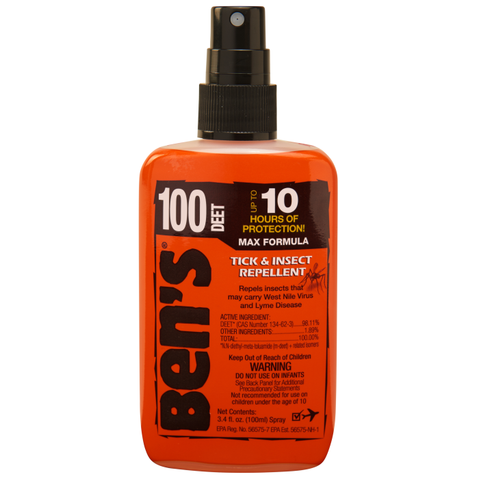 Experience unparalleled protection against biting insects with Bens 100 MAX Insect Repellent Spray. Specially formulated with the highest concentration of DEET, this odorless repellent is designed for challenging environments where insect activity is intense. Offering up to 10 hours of defense, it effectively repels ticks and insects that may carry diseases such as Zika, West Nile Virus, Lyme disease, and more. Conveniently packaged in a TSA-compliant 3.4oz spray, it’s the perfect travel companion for any adventure.