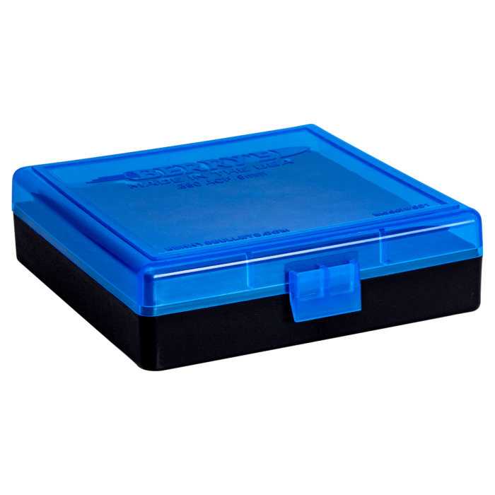 Optimize your ammunition storage with this durable 100-round ammo box designed for 380/9mm cartridges. Crafted from high-impact polypropylene, it promises resilience against cracking and warping, ensuring long-lasting use. The innovative design features a robust flip-top lid for secure and effortless one-handed access. Its blue and black finish adds a sleek touch, while the stackable build maximizes space efficiency. With precision dimensions of 1.23 inches OAL by .40 inches, this box is ideal for organized and efficient ammo management. The reliable snap hinge ensures your ammunition stays securely stored wherever you go.