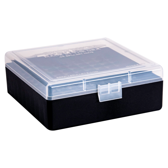 The Berry's 100-round Ammo Box in clear black is expertly crafted from high-impact polypropylene, ensuring durability that resists cracking, chipping, and warping. Its stackable design and robust flip-top lid make it perfect for secure and convenient storage, allowing one-handed access to your .38 Special and .357 Magnum rounds. With precise dimensions of 1.68" OAL x .40", this ammo box offers reliable protection and ease of use for shooting enthusiasts.