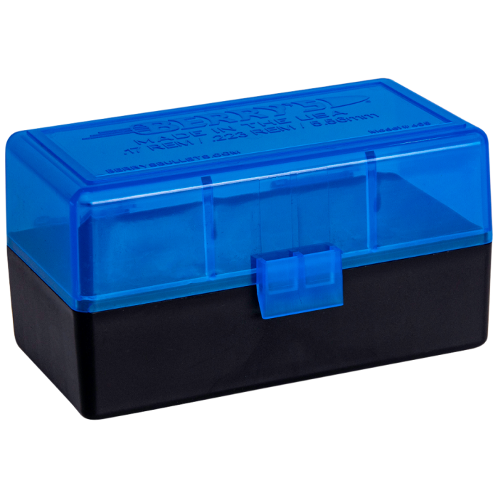 This 50-round ammo box, crafted from durable high-impact polypropylene, offers superior resistance to cracking, chipping, warping, and expansion. Designed for .223 Remington and 5.56 NATO cartridges, its robust fliptop design ensures secure storage and convenient one-handed access. With dimensions of 2.33" OAL x .42", this box is fully stackable, making it an efficient choice for organized ammo storage. The blue and black color scheme adds a sleek touch, distinguishing it from typical storage options.
