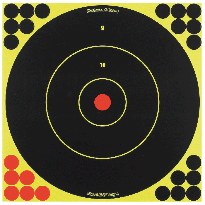 Birchwood's shoot-n-c 12" bull's-eye targets bullet holes are revealed with bright chartreuse rings.With instant feedback, no need to walk downrange or use binoculars or spotting scopes.These targets are great for indoor or outdoor and low light shooting.Great for long-range rifle shooting- 200 yards and beyond.The greater surface area makes them the perfect choice for use with muzzleloaders, shotgun slugs and to show shotguns patterns.Self adhesive backing makes target easy to put up.Includes 120 pasters to extend target life.