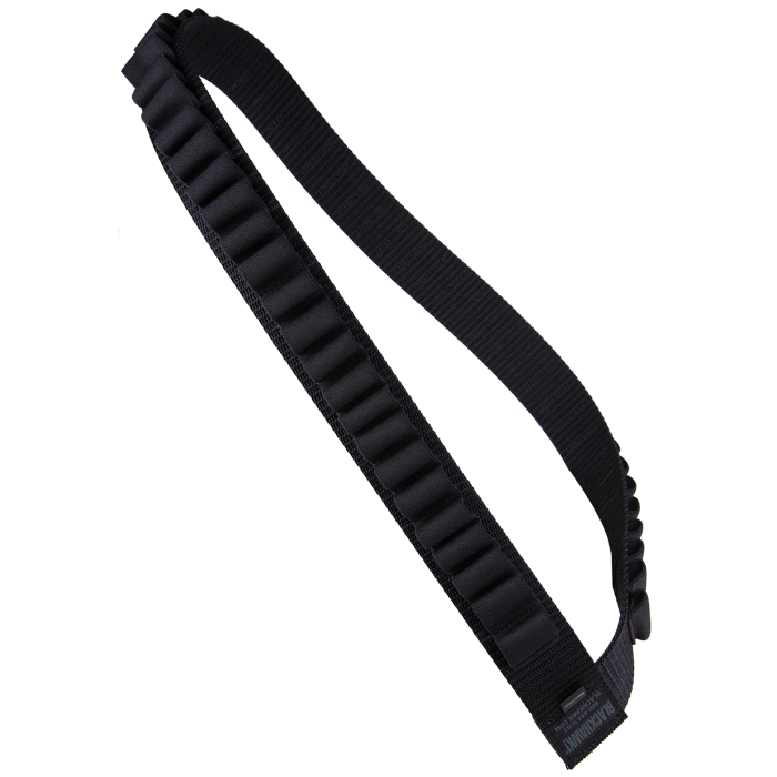 Carry your ammunition with ease using this Blackhawk Shotgun Bandoleer. Expertly crafted from sturdy black nylon, it features a smooth finish for comfortable wear. This bandoleer is designed to securely hold up to 55 shotgun shells, thanks to its 2.25-inch military pistol belt nylon webbing and 1.5-inch wide elastic. Universally fit for all shotgun models, it offers a reliable over-the-shoulder mount for quick access and convenience. Perfect for those who demand both durability and functionality in the field.