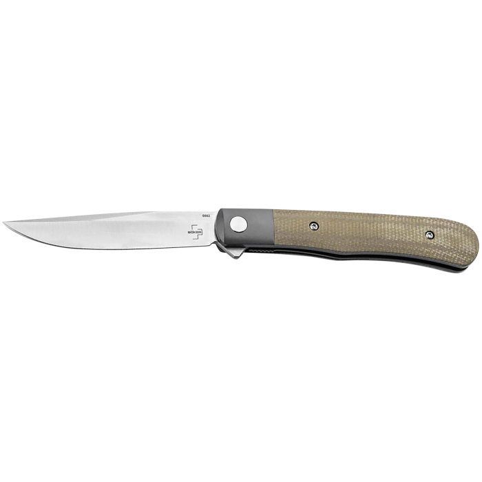 The Boker Plus Modern Trapper Uno is a contemporary gentleman's knife inspired by 19th-century design. Featuring a titanium-coated front bolster, grey micarta handle scales, and a ball-bearing Nitro-V drop-point blade, it offers smooth functionality with a flipper and liner lock. Slim and lightweight at 2.43 oz, it boasts a 3.23" blade for modern convenience while honoring timeless craftsmanship.