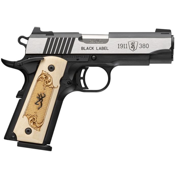 Experience precision and style with the Browning 1911-380, a compact firearm designed for accuracy and comfort. This model boasts a 3.63-inch barrel and an 8+1 capacity, making it ideal for personal defense. The sleek matte black frame is complemented by serrated sides for a secure grip, while the stunning maple wood grips feature intricate checkering and a gold Buckmark medallion, adding a touch of elegance. Equipped with 3-Dot combat sights and ergonomic, skeletonized controls, this pistol ensures enhanced targeting and ease of use. Its stainless steel finish with brushed polished flats exudes durability and sophistication, setting it apart from other handguns in its class.
