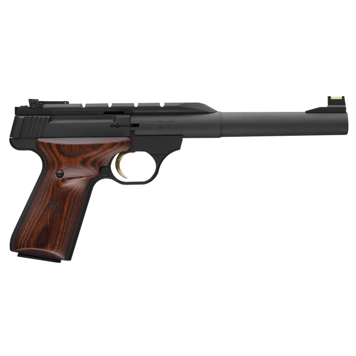 The Browning Buck Mark is a precision-engineered .22 LR pistol designed for both recreational shooting and training. It features a 7.25-inch tapered bull barrel that enhances accuracy and control. The frame is crafted from durable aluminum alloy with a sleek matte black finish, offering a perfect balance of style and strength. This pistol comes with a reliable single-action operation and a manual thumb safety for added security. The TruGlo fiber optic front sight and adjustable Pro-Target rear sight ensure quick target acquisition and precise shooting. The laminate cocobolo grips provide a comfortable and secure hold, while the optic-ready serrated slide allows for easy customization. With a 10+1 capacity, the Buck Mark is ideal for those seeking a reliable and stylish firearm.
