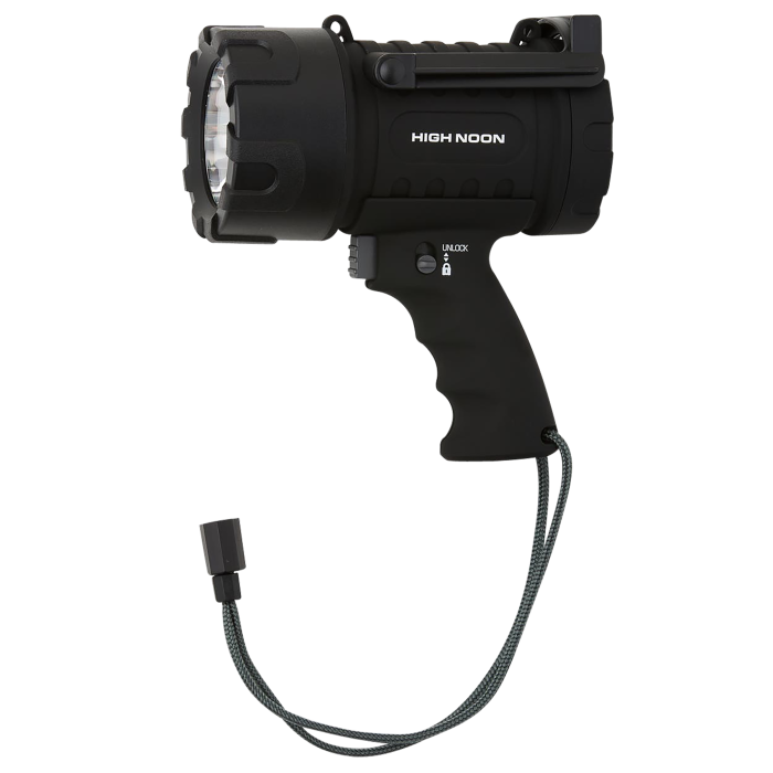 Compact, ultra-bright LED spotlight delivering 90-1000 lumens, powered by 4 C batteries. Floating, waterproof, and impact-resistant, it features multiple modes, a lockout switch, adjustable hands-free stand, and lanyard. Durable polycarbonate body ensures reliable performance for any adventure.
