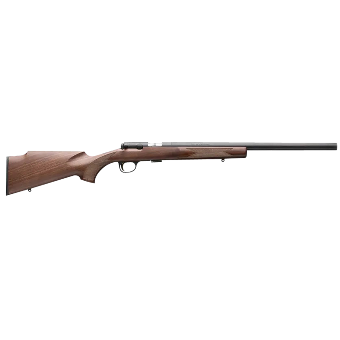 The Browning T-bolt 22 LR rifle combines precision engineering with a classic design, making it ideal for both novice and seasoned shooters. Featuring a 20-inch heavy bull threaded barrel, this rifle ensures consistent accuracy with every shot. Its adjustable gold-plated trigger allows for a customized shooting experience, while the right-hand bolt action provides smooth operation. With a capacity of 10+1 rounds, this rifle is perfect for extended sessions at the range. The raised comb stock, finished in a rich brown, offers comfort and stability, complemented by the durable stainless steel receiver. Weighing in at 6.12 pounds and measuring an overall length of 38.25 inches, it is lightweight yet sturdy. The crossbolt safety ensures secure handling, and the threaded muzzle with a protector adds versatility for those who wish to add attachments. This rifle exemplifies quality craftsmanship and reliability, making it a valuable addition to any firearm collection.