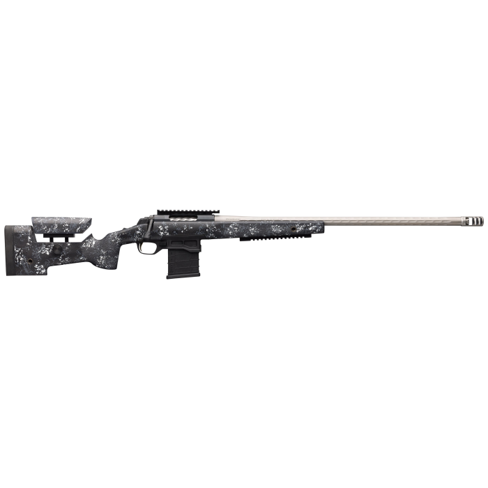 The Browning X-bolt 6mm Creedmoor is a precision bolt-action rifle designed for long-range target shooting and competition. It features a 26-inch heavy fluted barrel with a Recoil Hawg muzzle brake, which reduces recoil to improve shooting accuracy. The rifle's adjustable Target DLX trigger allows for a customizable pull weight, enhancing shooter control. The steel receiver provides durability, while the fixed McMillan A3-5 stock with an adjustable comb offers stability and comfort. With a capacity of 10+1 rounds and a top tang safety, this rifle combines performance and safety in a sleek black finish. Its right-hand design and extended bolt handle ensure smooth operation, making it an excellent choice for precision shooters.