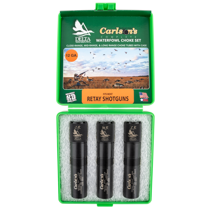 Carlson’s Waterfowl Choke Tubes 12GA Mid/Long Range Stainless delivers unmatched precision for your shotgun. Designed with an extended 3/4" barrel projection, these tubes protect your barrel from prolonged steel shot use while ensuring dense, consistent patterns. Made from durable 17-4 stainless steel with a sleek blue finish and knurled extension for easy handling. Perfect for larger steel shot and tighter choke constrictions, the longer parallel section guarantees fewer flyers. Compatible with Retay 12-gauge shotguns and includes three choke tubes for versatile mid-range performance. Optimal for loads under 1550 fps.