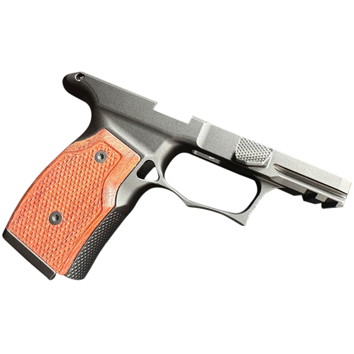 Upgrade your Sig P365 or P365XL with the Sharps Bros Aluminum Grip Module in a striking Black Cherry finish. Crafted from durable 7075 T-6 Aluminum, this grip module enhances your shooting experience with a wider 1.3-inch grip compared to the standard 1.1-inch, offering a robust feel without sacrificing concealability. The enhanced trigger guard and finger grooves provide superior comfort and control, while the ambidextrous gas pedal offers a natural thumb ledge and indexing point for both left and right-handed shooters. Featuring an M1913 Picatinny accessory rail and a flared magazine well, this module is a direct replacement for the OEM polymer version, combining style with functionality. Weighing approximately 4.3 ounces with wood panels, it's designed for those who demand more from their firearm.