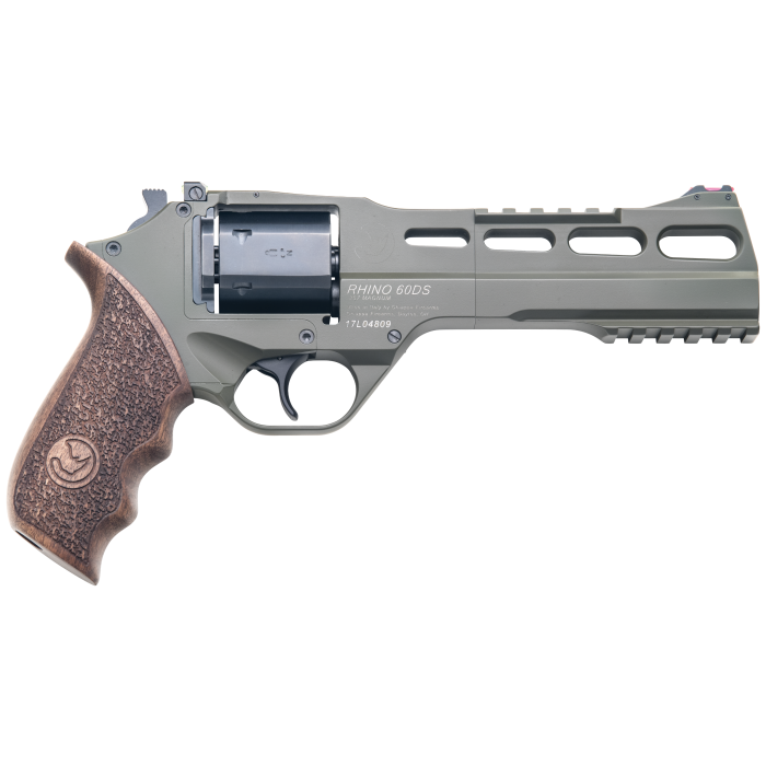 The rhino is the most innovative development in revolver technology in decades.It fires from the bottom of the cylinder rather than the top which dramatically reduces muzzle rise and recoil felt by lowering the axis of the bore almost to the palm of the shooters hand.An aluminum alloy frame and barrel shroud makes the rhino lightweight and easy to carry.The snag resistant "hammer" is actually a cocking device because of the rhino's innovative completely enclosed firing mechanism which can be fired single action.A cocked indicator is clearly visible to indicate the internal hammer status.Another innovation is the hexagonal cylinder which keeps the revolver's width to a minimum.Included is a fiber optic front sight.This single action model has a 6" barrel and has a od green frame and barrel finish, black cylinder, and walnut grip.