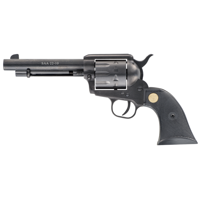A 10-shot version of the classic single action in caliber.22lr.One of the most accurate reproductions of the 1873 single action.While maintaining the true to form classic design, this single action revolver is a hybrid of modern technology and manufacturing with the feel of the old west.This revolver is crafted with a steel rifled barrel and cylinder, alloy frame, black plastic grips and fixed sights.