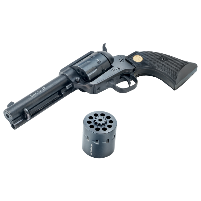 A 10-shot version of the classic single action in caliber.22lr one of the most accurate reproductions of the 1873 single action.While maintaining the true to form classic design, this single action revolver is a hybrid of modern technology and manufacturing with the feel of the old west.This revolver is crafted with a steel rifled barrel and cylinder, alloy frame, black plastic grips and fixed sights.