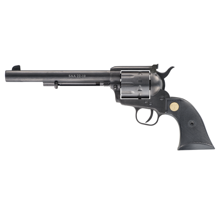 A 10-shot version of the classic single action in caliber.22lr.One of the most accurate reproductions of the 1873 single action.While maintaining the true to form classic design, this single action revolver is a hybrid of modern technology and manufacturing with the feel of the old west.This revolver is crafted with a steel rifled barrel and cylinder, alloy frame, black plastic grips and fixed sights.