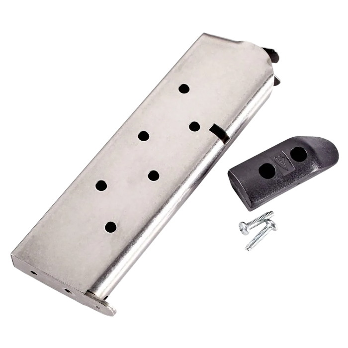 This Classic .45 8-round magazine is designed for the 1911 platform, compatible with both Commander and Government models. Featuring a robust stainless steel construction, it ensures durability and reliable performance. The sleek silver finish adds a touch of elegance, while the base pad enhances handling and ease of use. Specifically tailored for the .45 Auto (ACP) cartridge, this magazine offers an ideal blend of functionality and style for firearm enthusiasts.