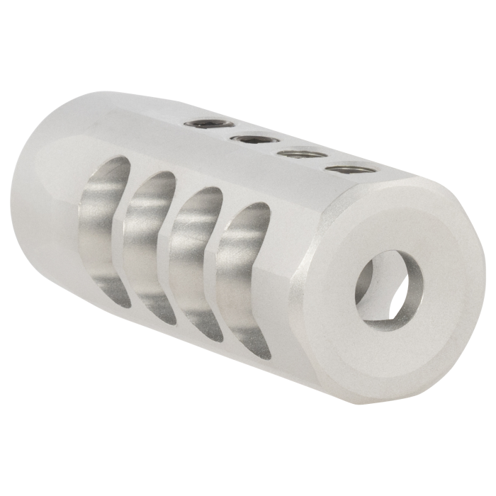 The Christensen Arms Side-Baffle Titanium Muzzle Brake .223 is expertly designed for shooters seeking precision and performance. Crafted from lightweight yet durable titanium, this muzzle brake is tailored to fit a .920 bull barrel diameter. Its innovative design includes four large side ports that significantly reduce felt recoil and minimize debris blowback when shooting in a prone position. Additionally, the four threaded top ports allow for precise adjustments to control muzzle rise. With a 1/2"-28 tpi thread pattern, this muzzle brake offers superior functionality and reliability for any shooting enthusiast.