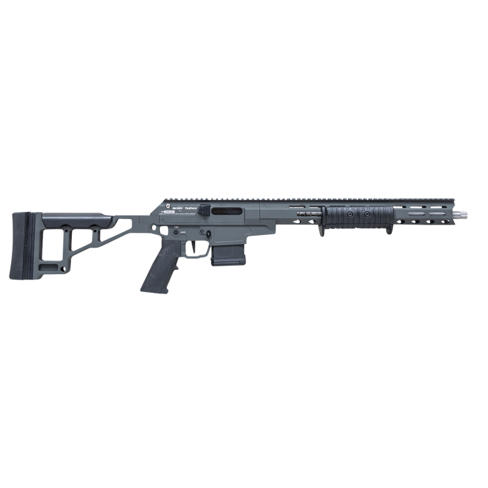 Designed with a dark grey Cerakote finish, the Citadel Taipan X not only looks sleek but also offers enhanced durability. The fixed skeletonized stock includes a padded buttstock for added comfort during extended shooting sessions. Quick-detach sling swivel sockets are integrated for convenient carry options. The rifle also features a threaded muzzle, allowing for the attachment of various muzzle devices. With a manual thumb safety and an aluminum receiver, this rifle is built for reliability and ease of use. The Citadel Taipan X ships with one 10-round magazine, making it a solid choice for both range shooting and tactical applications.