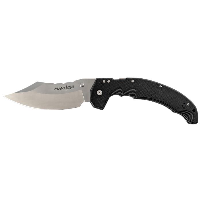The Cold Steel Mayhem 6" Cleaver is a durable folding knife built for strength and safety. Its 6" AUS-10A stainless steel modified cleaver blade pairs with an ergonomic black GFN handle. Featuring the innovative Atlas Lock, rigorously tested for extreme durability, it ensures secure one-handed operation. Weighing 11.90 oz with a 13.20" overall length, it's a robust tool for versatile use.