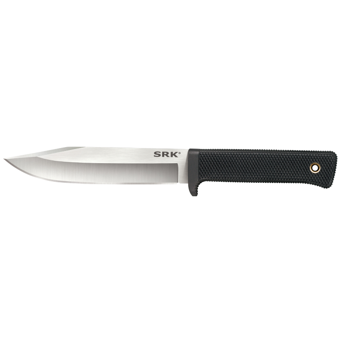 The Cold Steel SRK features a 6" 3V steel clip point blade, offering exceptional strength and edge retention. Its durable 10.75" overall length includes a 4.75" black textured Kray-Ex handle for a secure grip. Weighing 8.8 oz, this fixed-blade knife is designed for versatility and reliability, making it perfect for survival, rescue, or outdoor use.