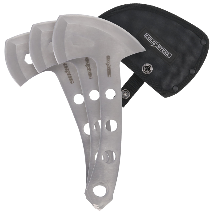 Cold Steel Throwing Axes set includes three versatile axes with 5" plain 420 stainless steel blades and a total length of 10". Designed for durability and precision, these reliable throwing tools come equipped with a nylon sheath for safe storage and transport, making them perfect for target practice or outdoor use.