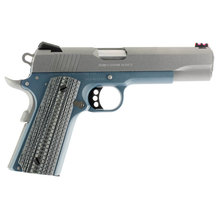 Colt's 1911 Competition pistol features custom G10 blue grips with a scallop design, dual recoil spring system, a National Match barrel. It has Novak sights for precision shooting; a red fiber optic front with adjustable rear sight. It comes with two magazines and spare sight fibers.