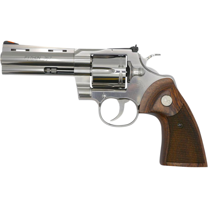 A recessed target crown user-interchangeable front sight and walnut grip with the iconic colt medallion. The python is chambered in .357 magnum and also accommodates 38 special cartridges.
