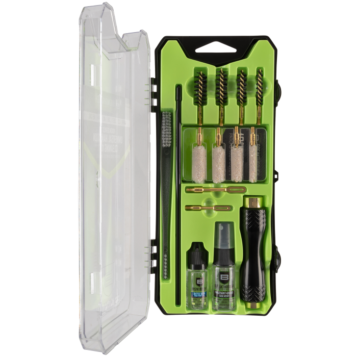 Achieve pristine firearm maintenance with the Breakthrough Clean Vision Series Universal Shotgun Kit. This all-inclusive kit is designed to keep your shotgun in peak condition, featuring a robust 23-piece set. It includes cleaning rod sections, a variety of hard bristle nylon brushes, jags, patch holders, and cotton patches. The durable aluminum handle with knurling ensures a comfortable grip, while the Military-Grade Solvent and Battle Born High-Purity Oil enhance cleaning efficiency. Everything is neatly organized in a convenient plastic box, complete with a plastic tray, ensuring your tools are always ready for action. Perfect for both enthusiasts and professionals seeking reliable performance.
