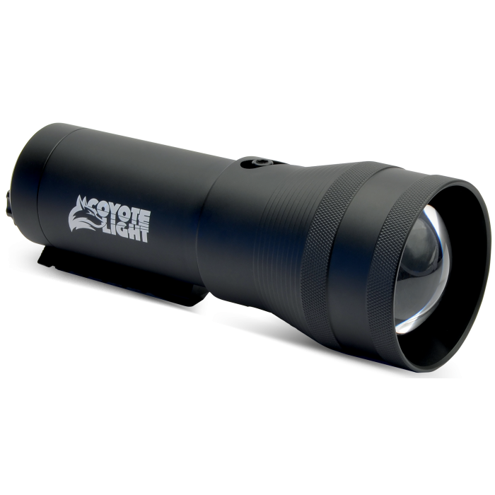 The Coyote Light Pro in matte black is a versatile and high-performance LED light designed for predator hunting. Crafted from durable aluminum, it offers the flexibility to be handheld or mounted on a gun scope or monopod. This splash-proof and fog-resistant light features a long-lasting solid-state LED with a lifespan of up to 65,000 hours and can run continuously for up to 48 hours. Capable of illuminating targets over 1,000 yards away, it includes an integrated Picatinny rail for easy mounting. The ultra-fast variable focus allows quick adjustments from spot to flood light with a simple turn of the dial. Powered by a rechargeable 18650 Lithium Ion battery, it weighs only 18 ounces and measures 8.5 inches in overall length.