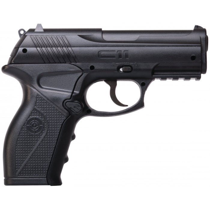 The Crosman .177 Air Pistol combines a sleek black finish with a robust green synthetic stock, offering a modern and durable design. With a smooth barrel and semi-automatic action, this CO2-powered pistol ensures reliable performance. It boasts a velocity of 480 feet per second and a generous capacity of 18+1 rounds. The fixed blade front and fixed notch rear sights provide accuracy, making it ideal for target practice. At 8.5 inches overall, its compact size is perfect for both beginners and experienced users seeking precision and ease of use.