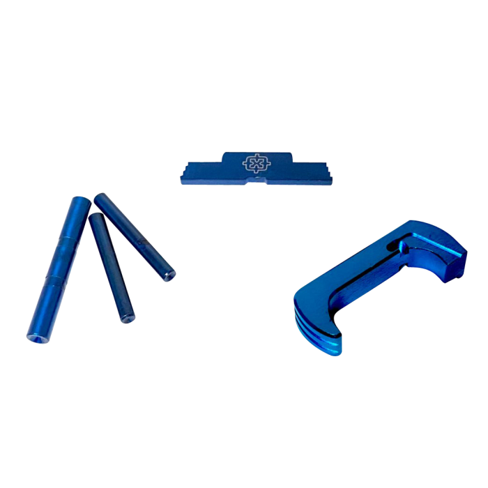 Cross Armory 3-Piece Kit Glock Gen5 Blue Anodized Aluminum combines durability, performance, and style in one package. Featuring a precision-machined 4140 steel dimpled pin set, extended slide lock, and an aluminum extended magazine catch, this kit is designed for superior functionality without compromising your holster compatibility. Specifically crafted to fit Glock 17/19/26/34 Gen5 models, it’s the ideal upgrade for reliable performance and sleek design in your firearm.
