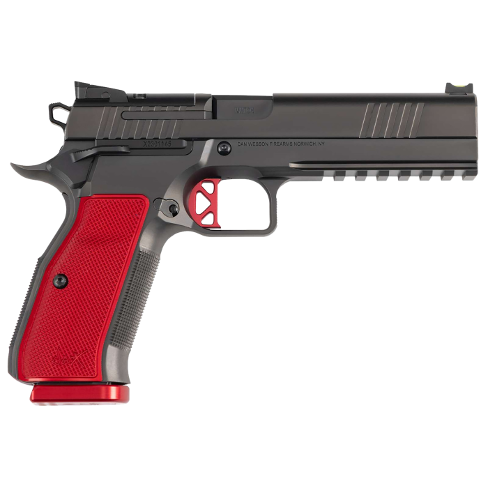 Experience precision and versatility with the Dan Wesson DWX 9mm pistol. Designed with a sleek black finish, this firearm features a 4.95-inch barrel and a 19+1 capacity, delivering power and reliability in a compact form. The red textured aluminum grips provide a comfortable and secure hold, while the ambidextrous thumb safety ensures ease of use for both left and right-handed shooters. The DWX incorporates a unique CZ-style takedown system with an optics-ready serrated slide for enhanced functionality. Compatible with CZ P10F and P09 double-stack magazines, this model also includes a fiber optic front and adjustable rear sight for superior accuracy. Ideal for enthusiasts seeking a high-performance pistol with customizable features.